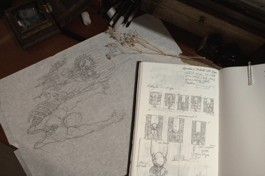 When tasked to create a piece that would pay homage to a very unique body of work that is Giger’s, I was left clueless on where to start for days. It wasn’t going to be anything Alien-esque, but I did want to revisit some of his paintings like Bombs II (1983) or Katarakt (2004) ─ and one my favourites, the Bar installation from the HR Giger Museum. Below are a look at some rough thumbnail sketches that were used to draft an idea of how I wanted the composition to look; the shapes & negative space. Soon I had the beginnings of what looked like a gate, and the idea to introduce some Norse-Pagan themes that would coincide with my body of work as well. The ‘Blood-Eagle’ ritual came to mind when incorporating the male figure in the center, and from there shaping the figure with some ‘Giger’ elements that would work for this project; flesh & bones, as well as other ‘adornments’ if you will.